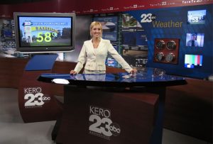 KERO-TV 23 in Bakersfield, CA, anticipated the requirement to go digital by 2009, by redesigning their existing newscast studio. A new anchor desk and weather report area, as well as redesigned backgrounds, all optimized for future high definition telecasts, necessitated an upgrade to the studio lighting design. Jeff Ravitz was contracted to evaluate the existing lighting and to design a plan to refocus and rebalance the entire studio. Much of the new design utilized equipment already in the station’s inventory, and KERO purchased additional equipment as specified by Ravitz. In addition, a remote news office set used for special segments, and a hallway through which the weatherman is followed into the studio, were also reworked for improved lighting.